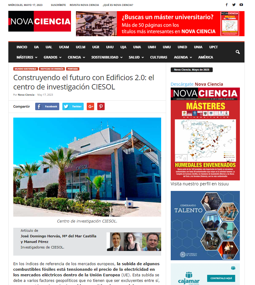 An article of divulgation named “Construyendo el futuro con Edificios 2.0: el centro de investigación CIESOL” has been published in Novaciencia (https://novaciencia.es/edificios-2-0-ciesol/).